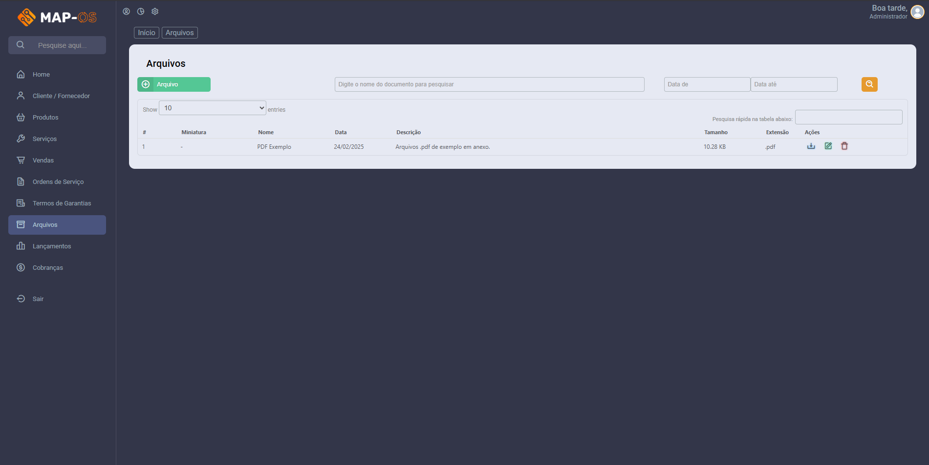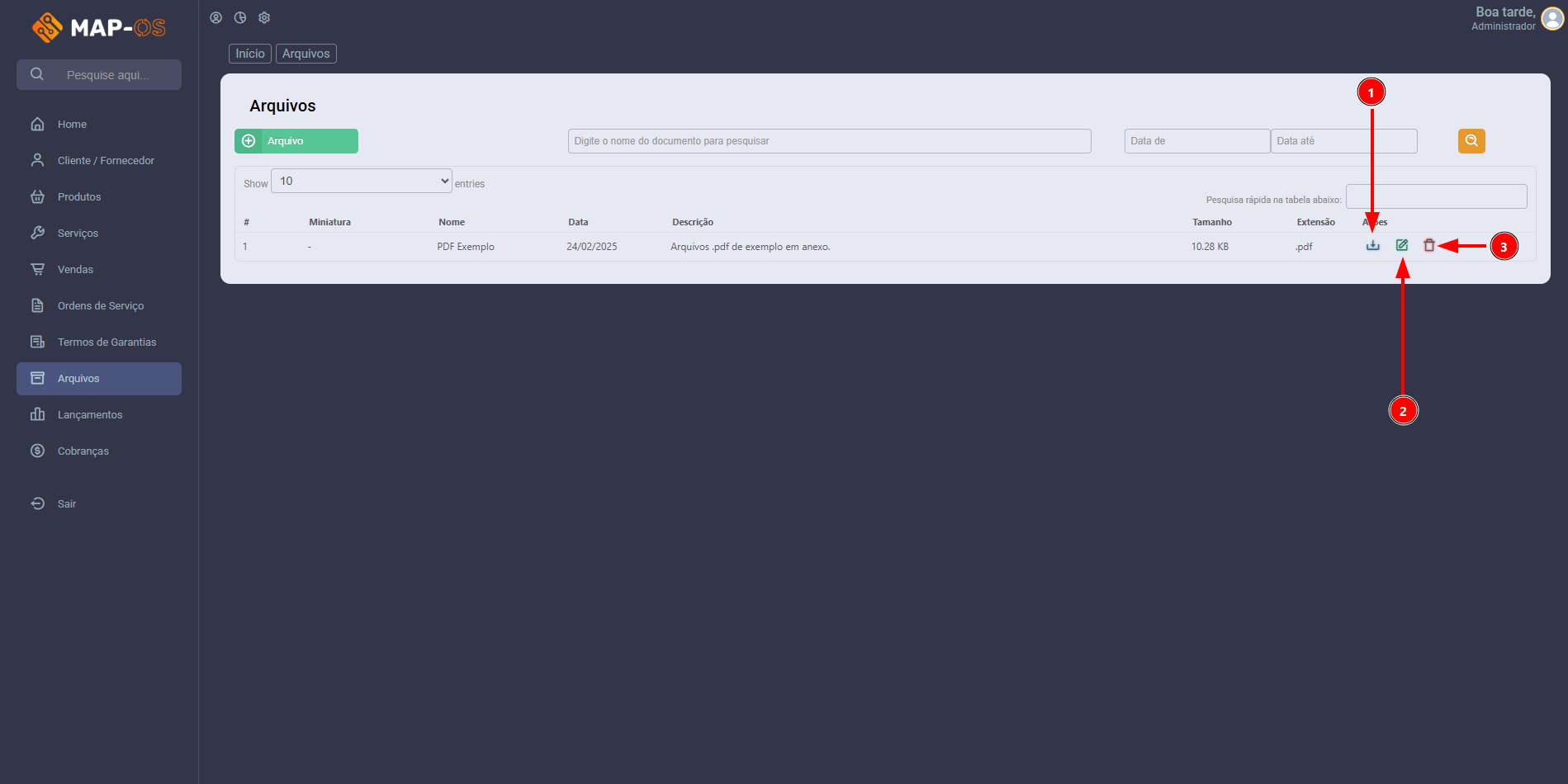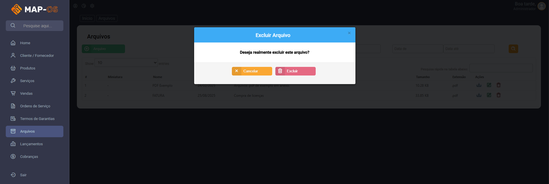 - Excluir o arquivo - Ao clicar, será solicitado a confirmação da exclusão do arquivo, e ao confirmar, o arquivo será excluído do sistema.