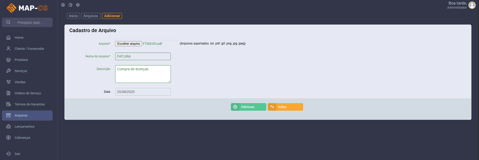 Para iniciar o cadastro de um arquivo, basta clicar no botão verde na tela geral dos arquivos. Ao clicar, será redirecionado para a tela abaixo, onde todos os itens marcados com o * (asterisco) é de preenchimento obrigatorio, ou seja, caso estejam em branco, não será possivel salvar o cadastro.