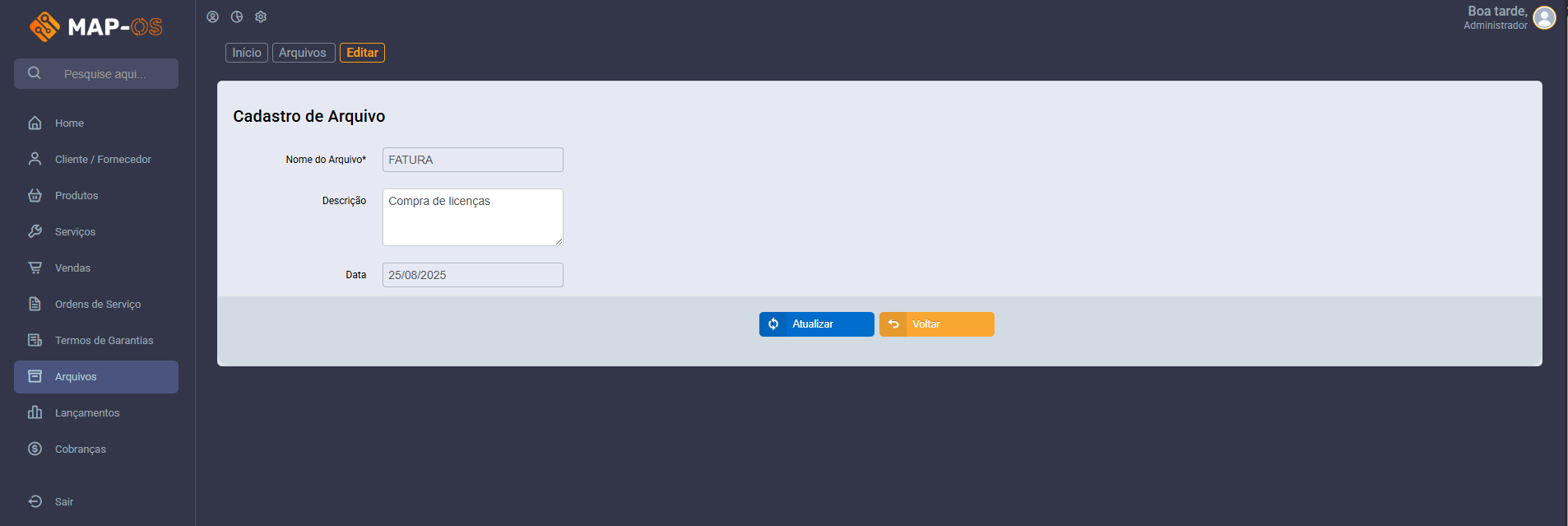 Na tela de edição, é possível alterar o nome e descrição, porém não é possível trocar o arquivo, para isso, indicamos a exclusão do arquivo e a inserção de um novo.