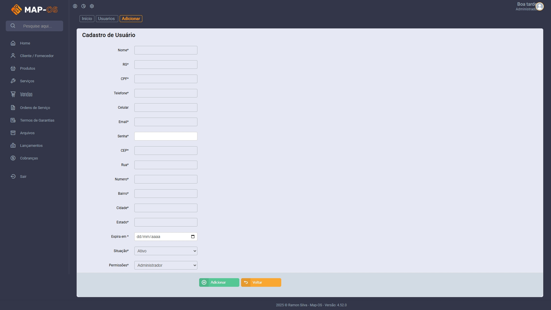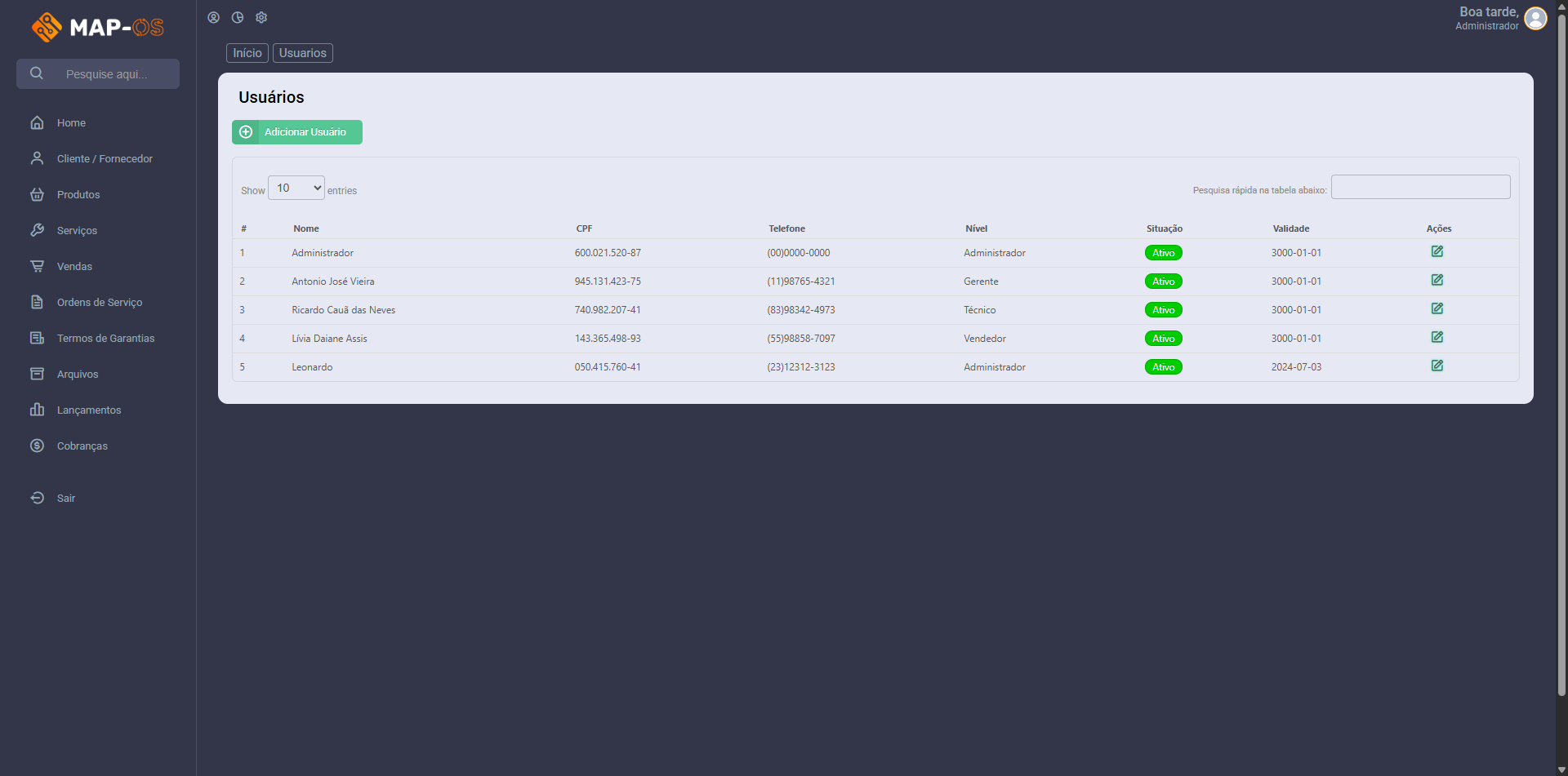 No sistema Map-OS, o gerenciamento de usuários é uma funcionalidade essencial que permite controlar o acesso e as permissões dentro da plataforma. Através do menu de configurações, os administradores podem adicionar, editar e remover usuários, bem como definir seus níveis de acesso.Geral