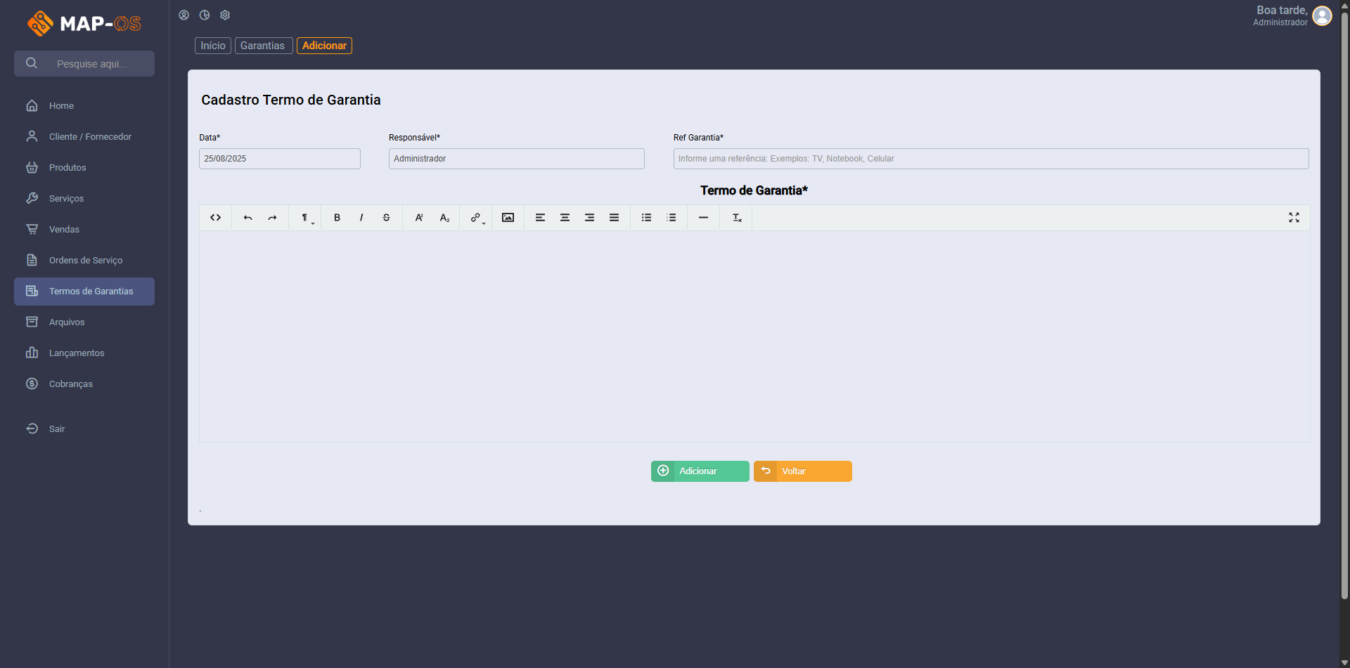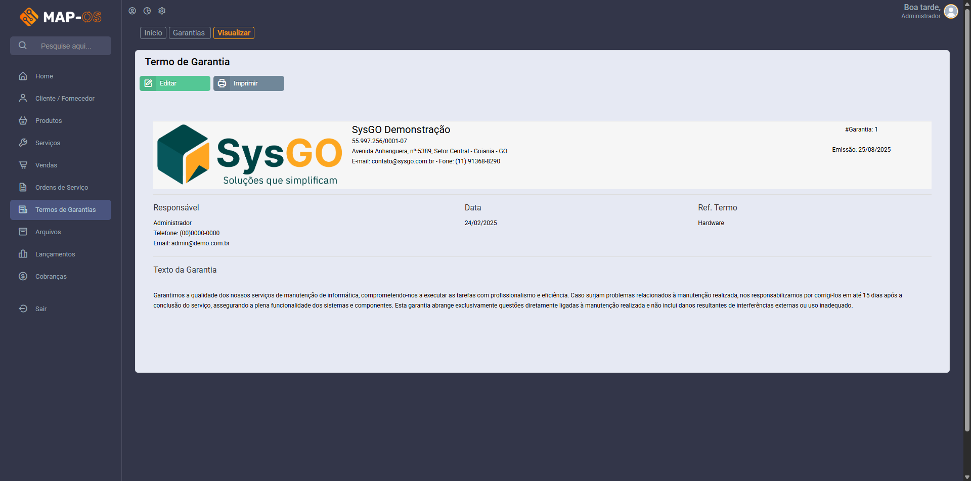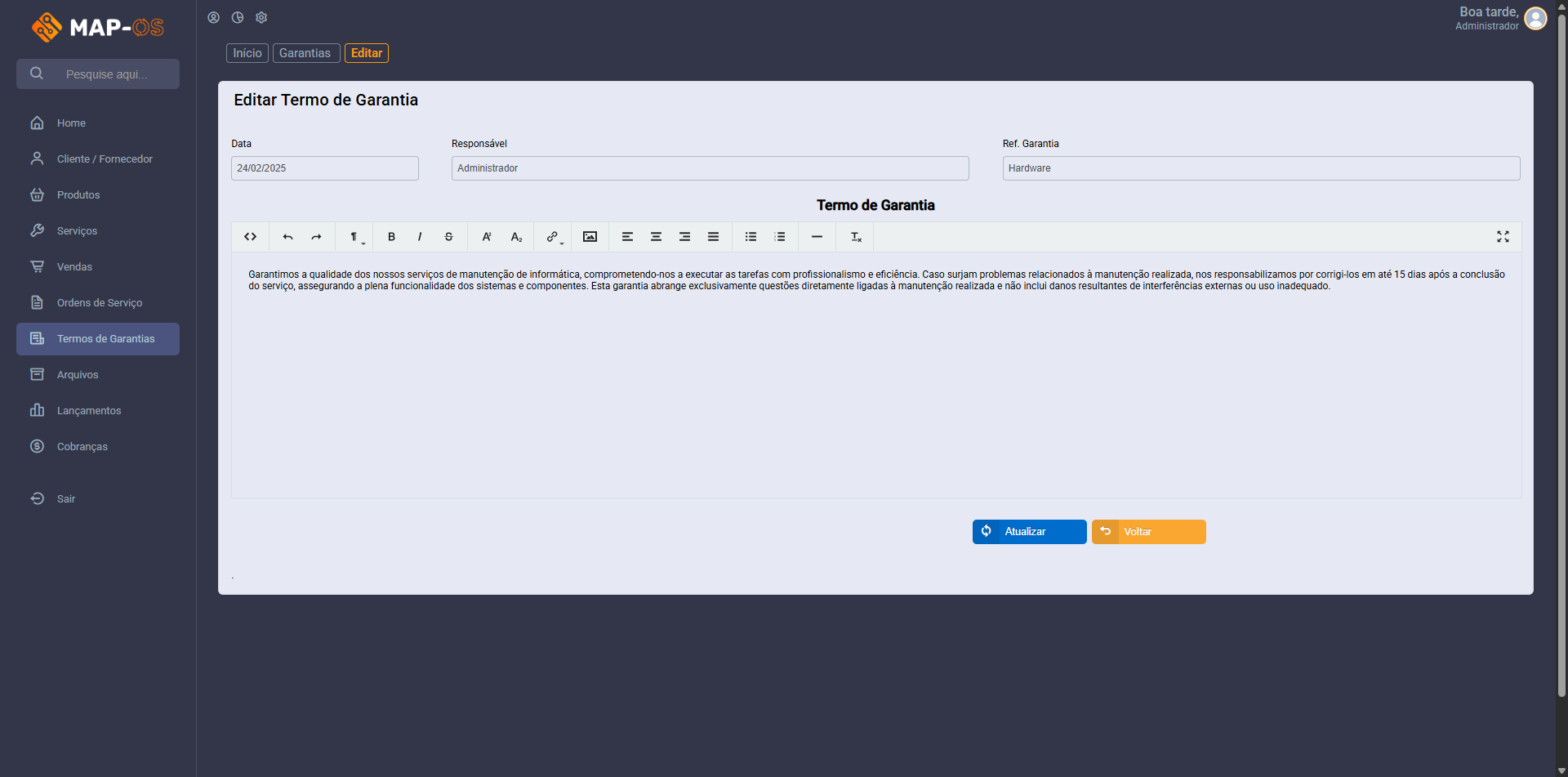 Na tela de edição, é possível alterar todos os campos do termo de garantia, como data, responsável, ref. garantia e o próprio termo de garantia.