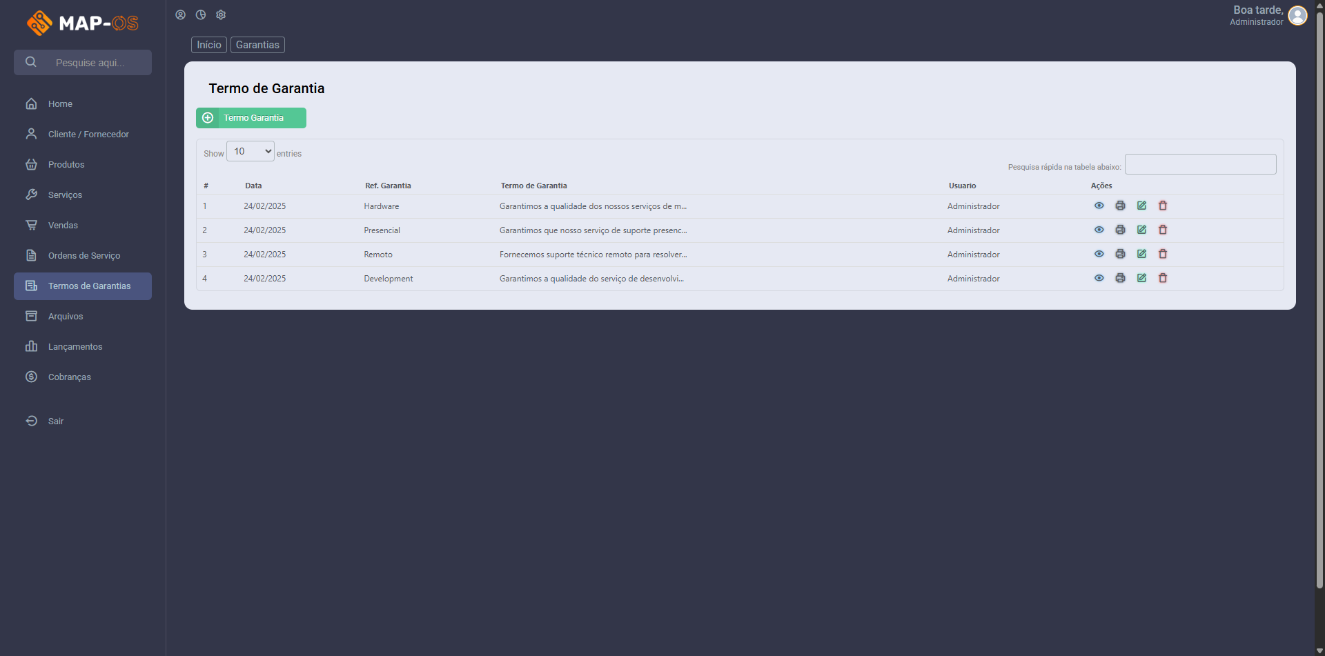 Ao acessar a tela via menu esquerdo, é apresentado todos os termos de garantia já realizados, mostrando seus principais dados, como nome, validade e as ações disponíveis, baseando-se no cadastro de permissões do usuário.