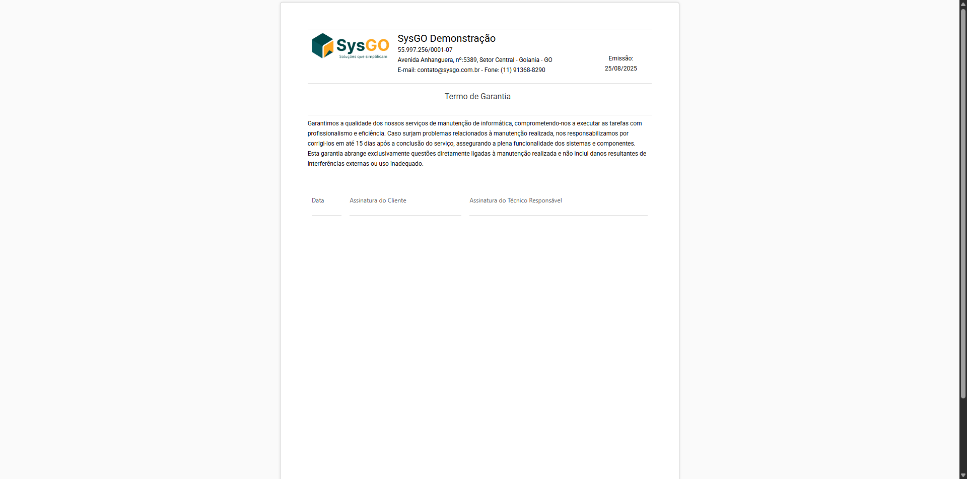 Estes termos podem ser associados a ordens de serviço para garantir que os clientes estejam cientes das condições de garantia aplicáveis aos serviços prestados.
