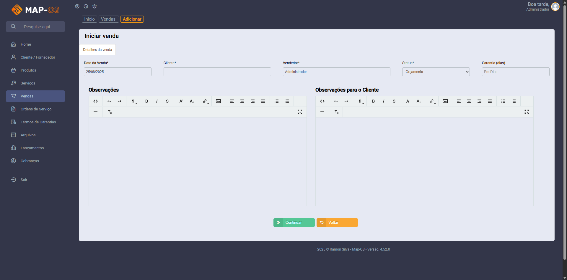 Garantia (dias): Se a venda incluir um produto ou serviço com garantia, insira o número de dias de garantia aqui. Observações: Qualquer observação adicional sobre a venda para conhecimento da equipe pode ser inserida aqui.