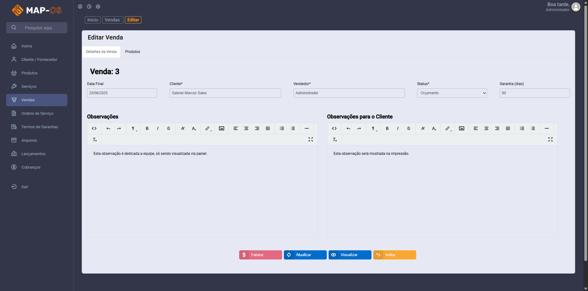 Observações para o cliente: Informações que serão exibidas no documento enviado ao cliente, como condições de pagamento, prazo de entrega, etc.