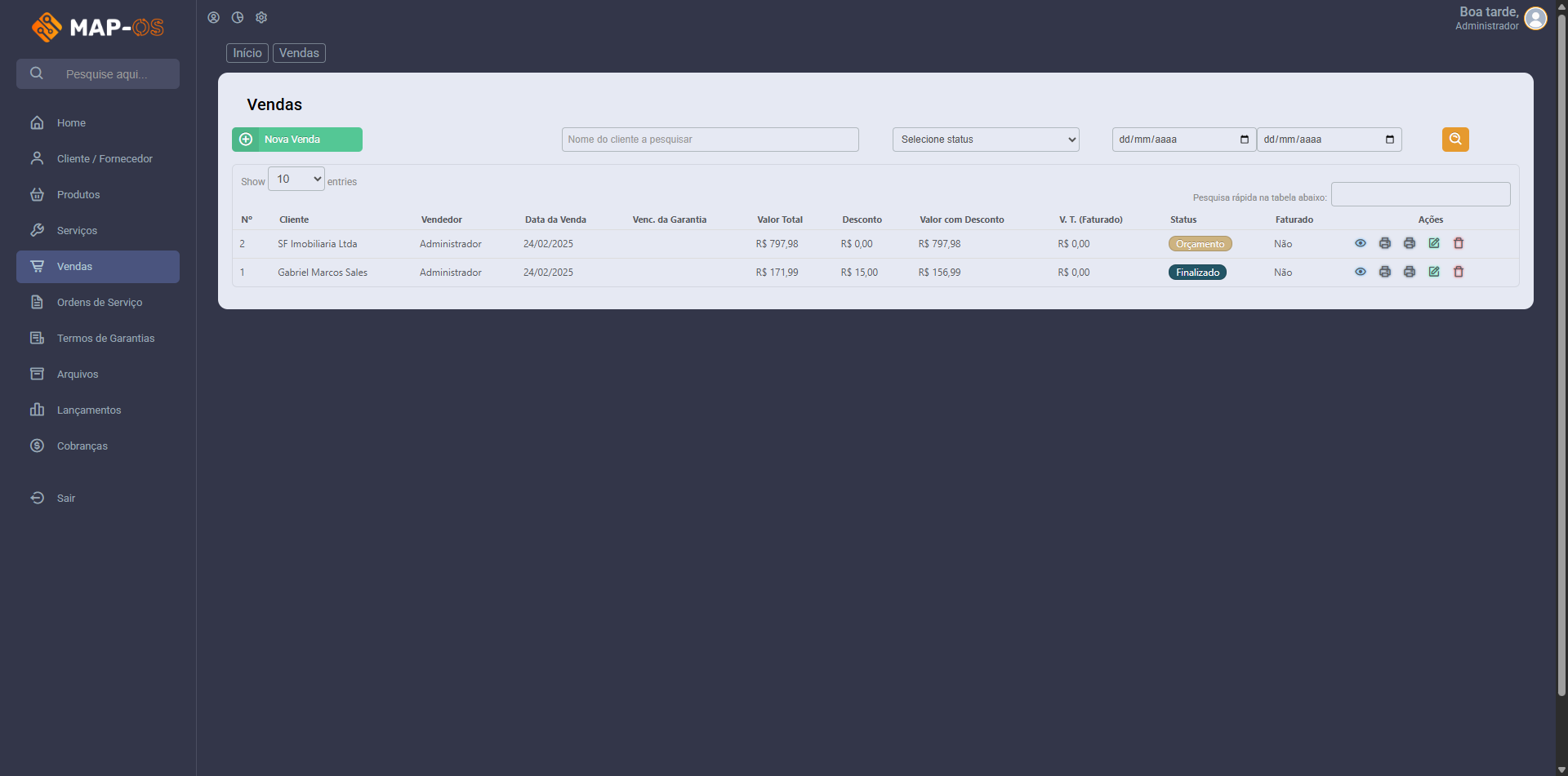 Ao acessar a tela (via menu esquerdo ou atalho), é apresentado todas as vendas já realizadas, mostrando seus principais dados, o cliente, o valor total e as ações disponíveis, baseando-se no cadastro de permissões do usuário.