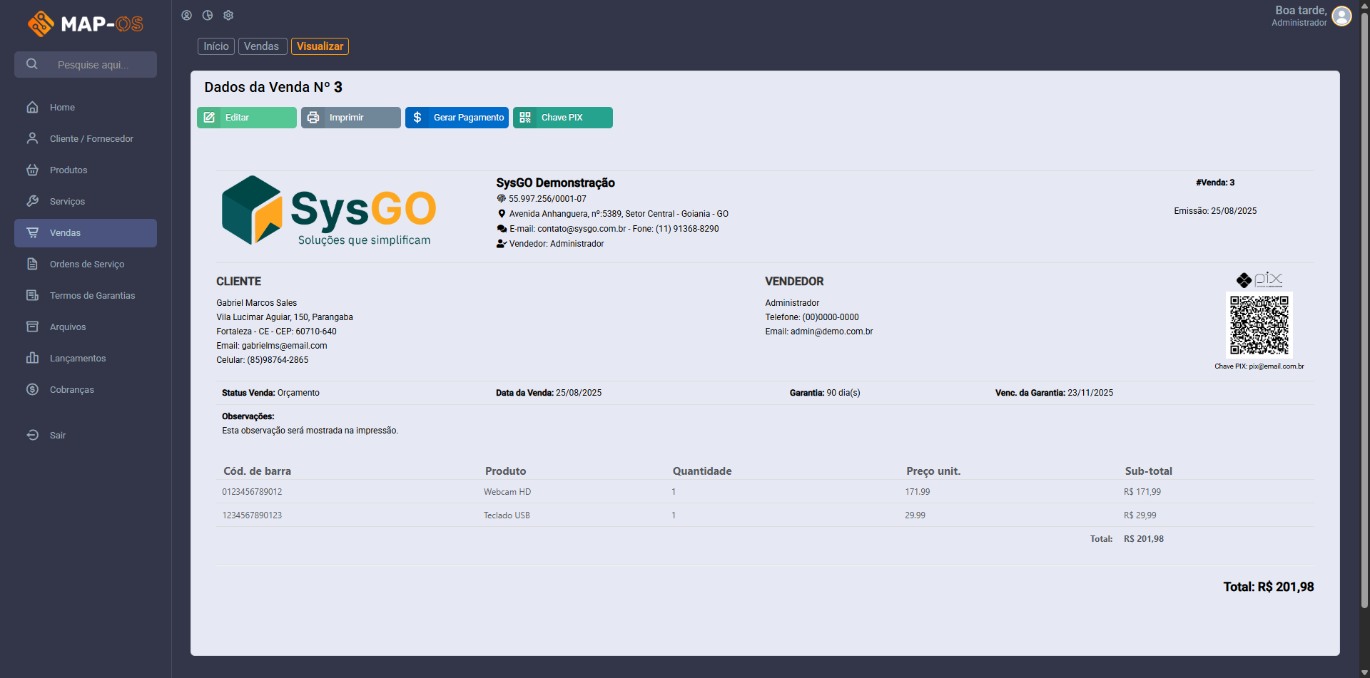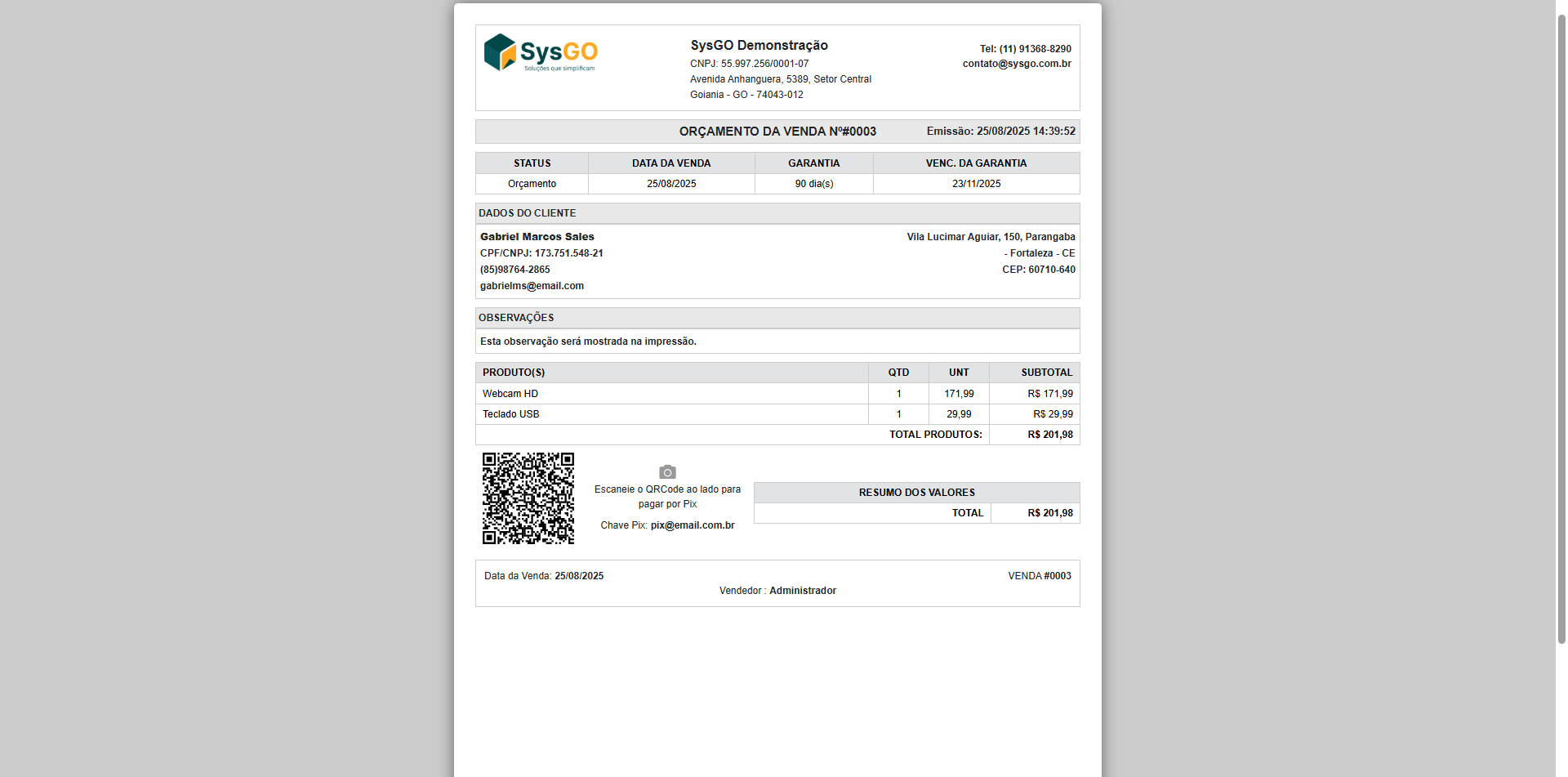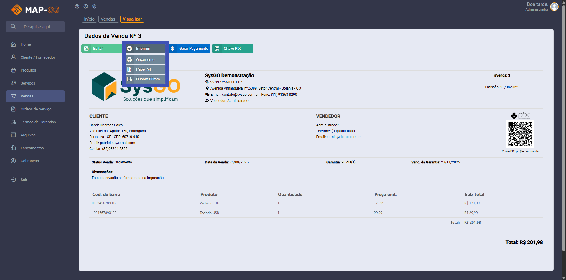 Nesta tela, também é possível imprimir a venda, gerar um PDF, enviar por e-mail para o cliente, editar ou excluir a venda, dependendo das permissões do usuário.