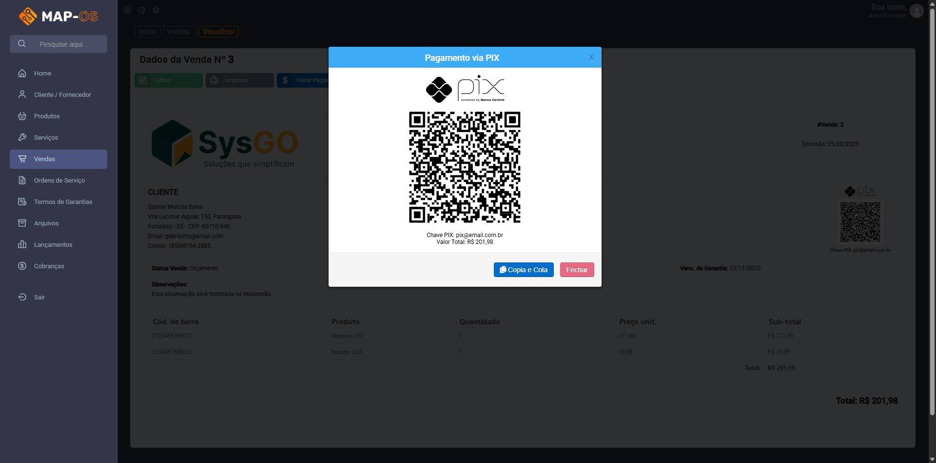 Caso tenha sido cadastrado a Chave pix na tela de configurações, será apresentado o botão para gerar o QR Code pix e o próprio QR Code na tela, facilitando o pagamento pelo cliente.